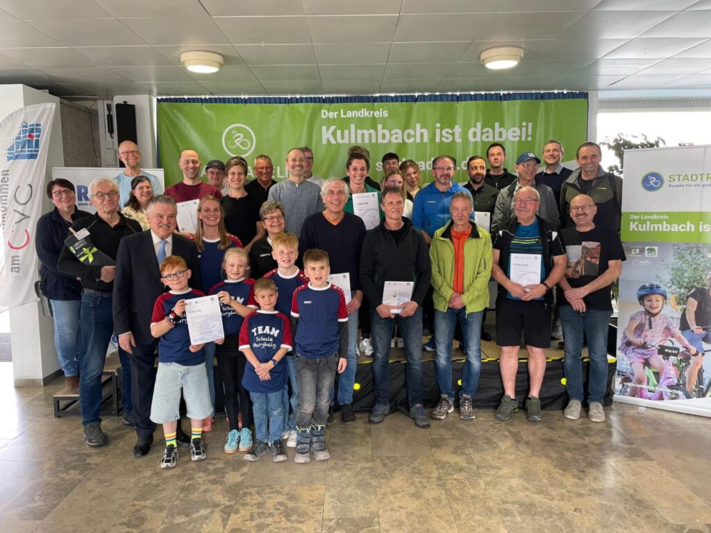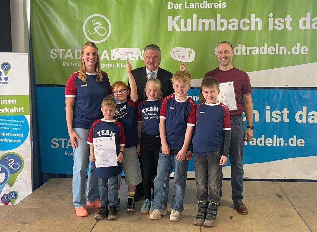 Bei der diesjährigen Preisverleihung des Kulmbacher Stadtradelns konnte sich unsere Schule den 1. Platz sichern. Mit viel Engagement und Begeisterung hatten Schülerinnen und Schüler, Lehrkräfte sowie Eltern gemeinsam zahlreiche Kilometer auf dem Fahrrad gesammelt und damit einen wichtigen Beitrag zum Klimaschutz geleistet. Stellvertretend für die Schulgemeinschaft nahm Frau Eva Schneider gemeinsam mit einigen Kindern im Landratsamt den Geldpreis entgegen. Die Freude über die Auszeichnung war bei allen Beteiligten groß, und die Kinder waren sichtlich stolz auf ihre Leistung.