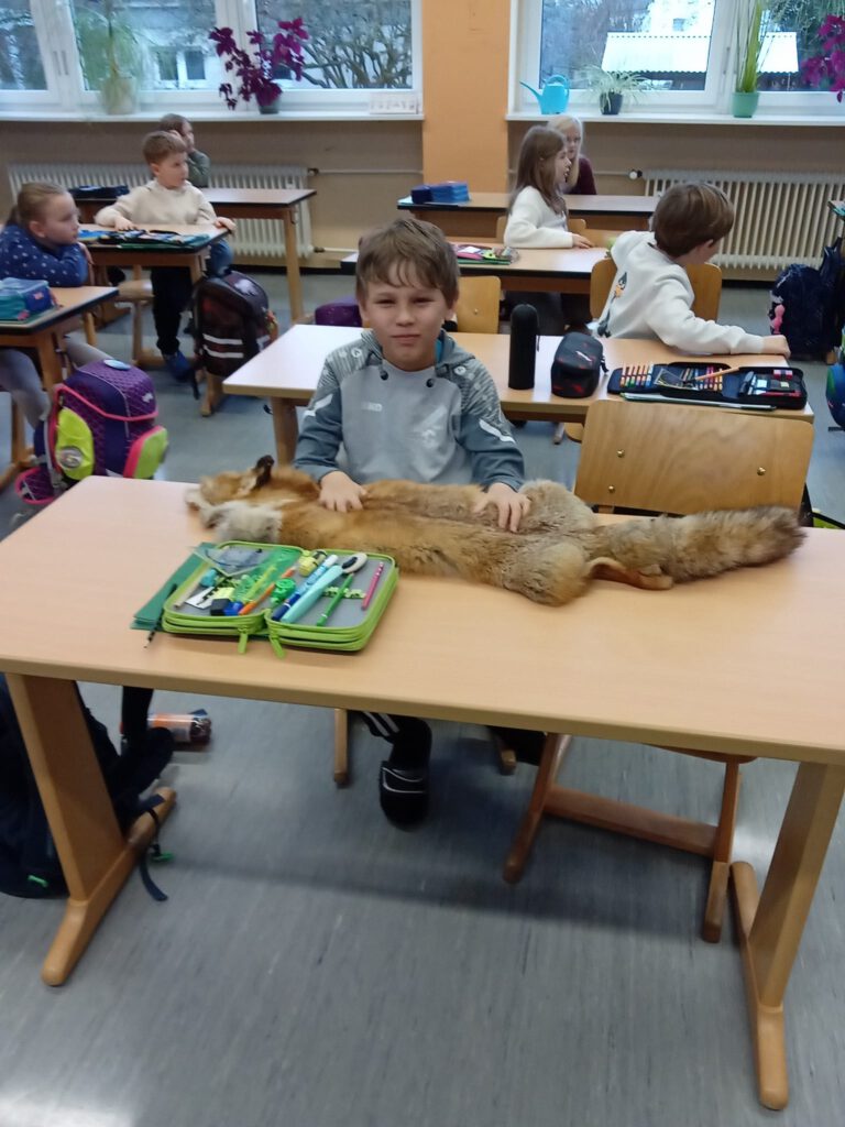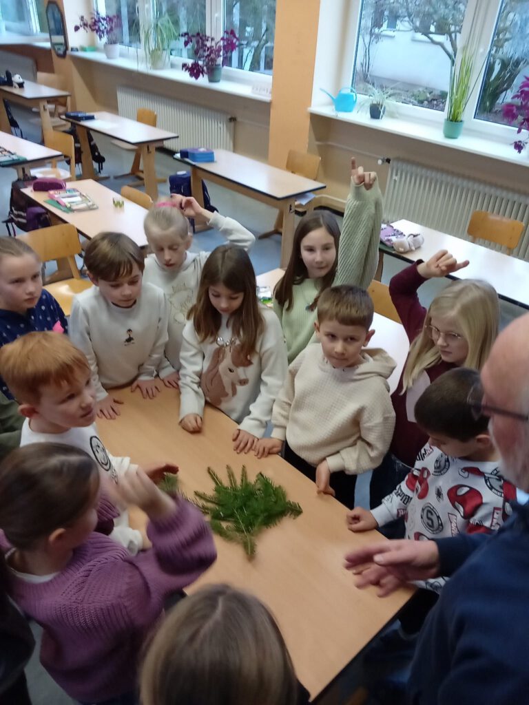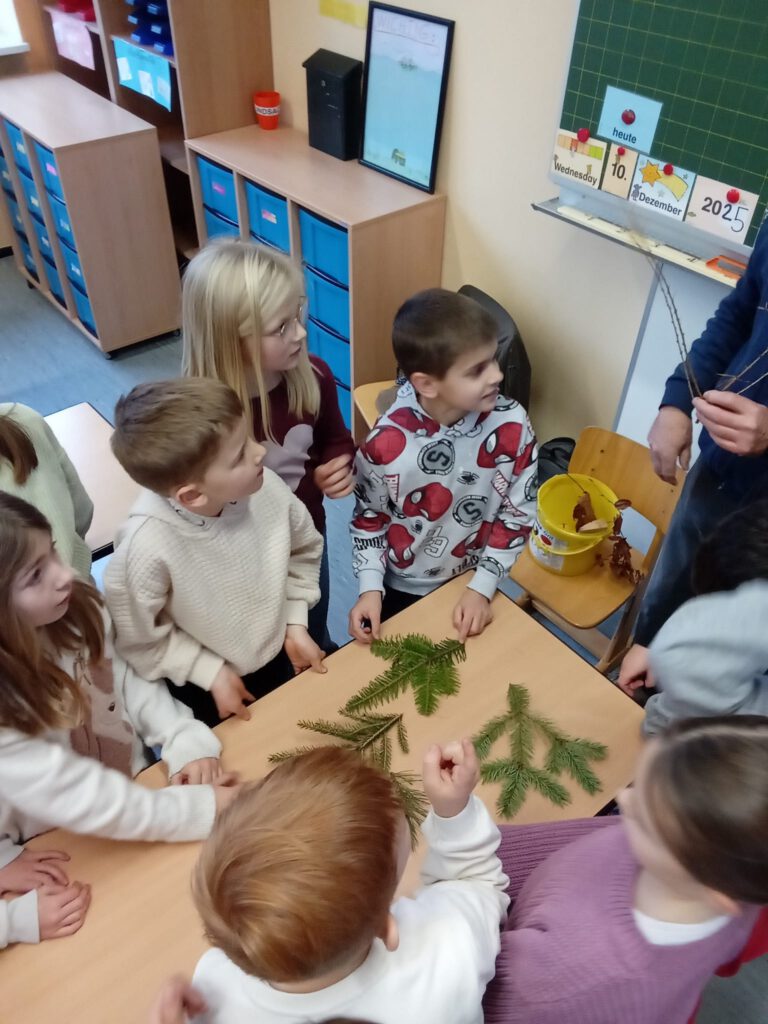 Mit großem Fachwissen und praktischen Beispielen erklärte der Förster verschiedene Themen aus dem Bereich Natur und Umwelt. Die Kinder hörten aufmerksam zu, stellten interessiert Fragen und beteiligten sich begeistert am Unterrichtsgeschehen.